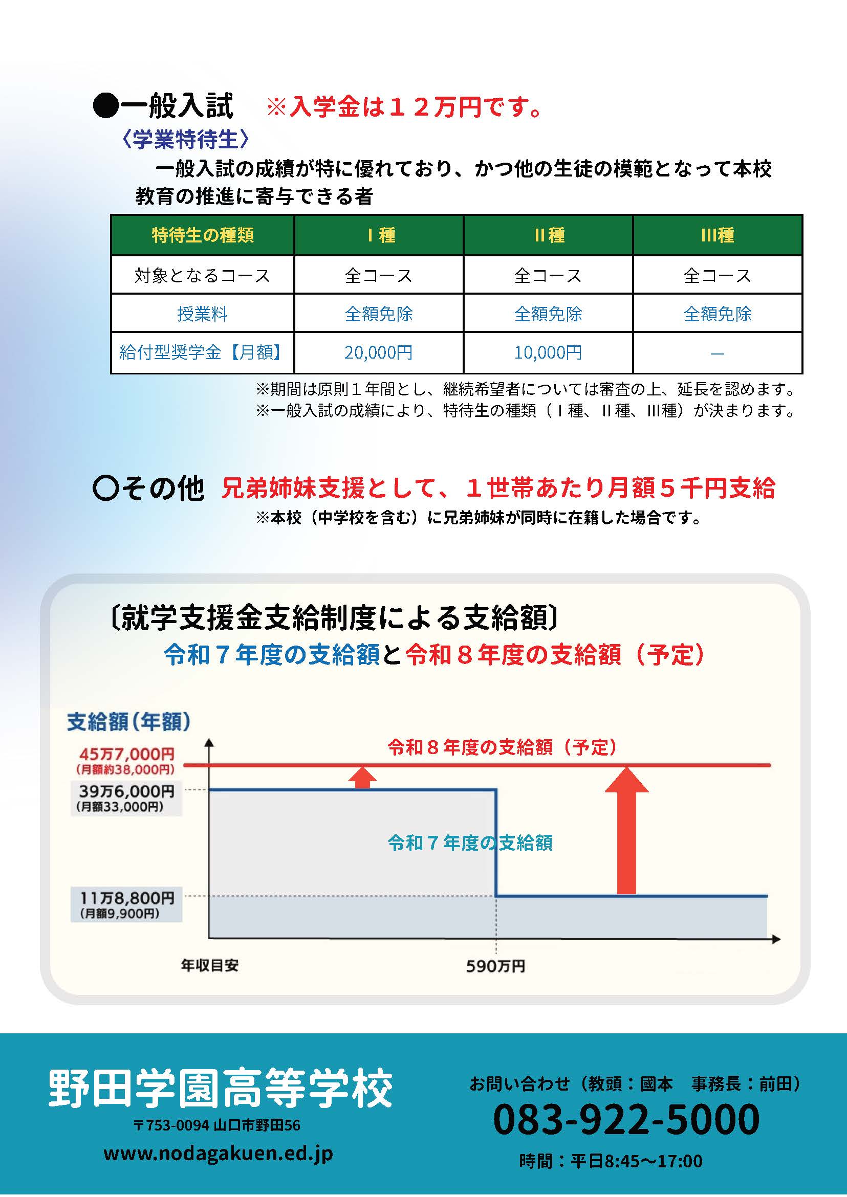 令和8年度野田学園高等学校 特待生制度(予定) 2025.11.10 令和8年度の就学支援金(いわゆる高校無償化)については、現在、国が検討中です。支給額が45万7千円となった場合の本校の特待生制度をお知らせします。 カテゴリー 全体 (91) 高校イベント (25) 中学校イベント (40) 高校 (194) 中学校 (71) 部活動 (150) 保護者 (7) その他 (4) アーカイブ (416) アーカイブ 2025年度 2025年11月 (11) 2025年10月 (13) 2025年9月 (23) 2025年8月 (18) 2025年7月 (16) 2025年6月 (15) 2025年5月 (7) 2025年4月 (13) 2024年度 2023年度 2022年度 2021年度 2019年度 2018年度 2017年度