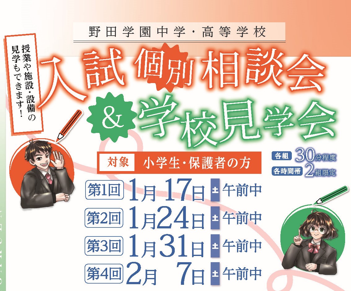 小学生とその保護者の方を対象とした、野田学園中学・高等学校「入試個別相談会」を開催いたします。